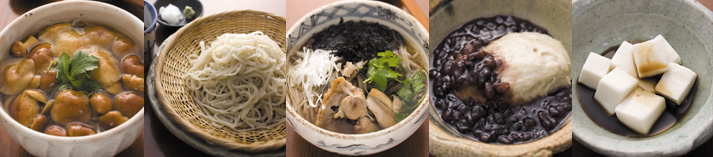 なめこそば 1,100円/石臼手挽きそばきり粗挽き 850円/ずいきそば 1,050円/そばぜんざい 600円/ごまとうふ 250円 |