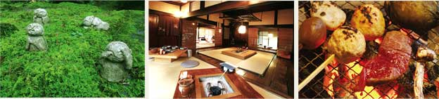 料理の方は、素材の味を生かして作られた新郷土料理。今日は一番人気の月コース(3,990円)をお願いした。 山門の梅の木から採った梅で作る梅酒から始まり、次々にやってくる綺麗に盛りつけられた料理。いずれも主張しすぎない優しい味わいがたまらない。 焼き物は、山形牛ヒレ、きのこ、弁慶飯、つくね、里芋と葡萄、焼き豆腐、鮎塩焼きがザルに盛りつけられて出てくる。 お客が自分で囲炉裏で焼いて食べるというスタイルだ。 網にのせて数分で香ばしい匂いが漂い、食べるのが待ち遠しくなる。 今ではなかなか触れることのできない古き良き日本の故郷をここ「生石大松家」で囲炉裏を囲んで、ゆっくりと味わってみてはいかだろうか。 |